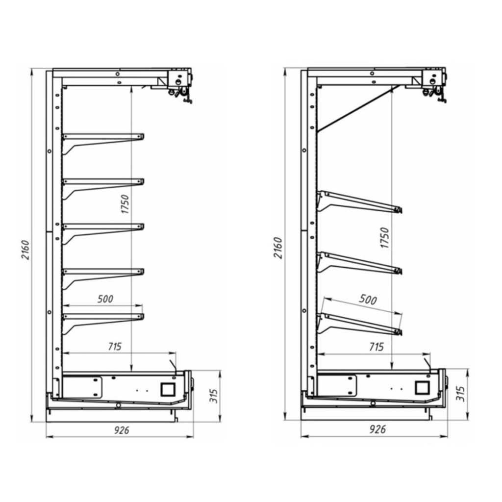 • Полочные модули: 5 полок глубиной 500 мм, с регулируемым наклоном, проволочными ограждениями и ценникодержателями на каждой.