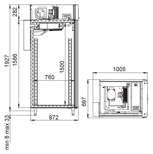 Каталог оборудования Холодильное оборудованиеШкафы холодильныеСпециализированные холодильные шкафыШкаф холодильный для вызревания салями Polair CS107 Salami черный, со стеклом Шкаф холодильный для вызревания салями Polair CS107 Salami черный, со стеклом Код товара: 062-632 Поделиться: WhatsAppTelegram СравнитьДобавить в КПВ избранное 0 373 915 ₽ В корзину 0 шт Под заказСамовывоз сегодня бесплатно Взять в кредит Купить в лизинг Получить консультацию в WhatsApp Описание Характеристики Отзывы 0 Инструкции 5 Шкаф холодильный для вызревания салями Polair CS107 Salami черный, со стеклом предназначен для приготовления и хранения салями, сыровяленых колбас и других мясных деликатесов на предприятиях общественного питания и торговли. Цельнозаливной монолитный корпус выполнен из нержавеющей стали снаружи и внутри (кроме задней стенки), что обеспечивает высокую прочность, долговечность и удобство ухода. Оборудование рассчитано на работу при температуре окружающей среды до +40 °С. Особенности: Динамическое охлаждение с мягким обдувом без заветривания Верхнее расположение агрегата Автоматическая оттайка с системой испарения конденсата Русифицированная многофункциональная панель управления с дисплеем диагональю 5" Возможность создания и сохранения индивидуальных программ Встроенный ультразвуковой увлажнитель (необходима подача очищенной воды и подключение к канализации) UV-лампа для обеззараживания воздуха внутри камеры Три уровня подвесов с тремя перекладинами и крюками на каждом уровне для удобной развески колбас Регулируемый уровень влажности: от 60 до 95 % Распашная дверь с заливной теплоизоляцией, встроенной ручкой и магнитным уплотнителем Отключаемая LED-подсветка камеры Штампованное углубление в дне корпуса для удобства ухода Педаль для удобного открытия двери Хладагент R290 (пропан) Толщина стенки корпуса: 43 мм Polair CS107 Salami черный, со стеклом — это профессиональный холодильный шкаф, идеально подходящий для цехов, гастробаров и мясных мастерских. Он обеспечивает оптимальные условия для дозревания и хранения деликатесов за счёт точного контроля температуры и влажности, продуманной конструкции и расширенного функционала. Такой шкаф помогает сохранять качество и вкус продукции на высоком уровне.Изображение товара, представленного на фото, может отличаться от его фактического вида. Показать все Габаритные размеры697×1005×1960 ммДиапазон рабочей температурыот -2 до +30 °CДлина697 ммШирина1005 ммВысота1960 ммОбъём700 лКол-во дверей1 Тип двериСтеклянная Уровень влажностиот 60 до 95 %Холодильный агрегатВстроенный Тип оттайкиАвтоматическая Тип охлажденияДинамическое ПодсветкаЕсть UV-лампаЕсть ХладагентR290 Вес нетто160 кгВес брутто190 кгБрендPolairВсе специализированные холодильные шкафы Из нержавейкиВсе специализированные холодильные шкафы Стеклянная дверь Оставить отзыв Еще никто не оставил отзыв на этот товар Схема POLAIR CS107 Salami.jpgИнструкция на POLAIR CS107 Salami.pdfБрошюра на POLAIR CS107 Salami.pdfДекларация о соответствии.pdfСертификат соответствия.pdf Похожие товары Перейти в каталог Под заказ 402 050 ₽ Шкаф холодильный для вызревания мяса Polair CS107 Meat со стеклом (Тип 2) Под заказ 207 942 ₽ Шкаф холодильный HURAKAN HKN-MA350 для созревания мяса Под заказ 389 300 ₽ Шкаф холодильный для вызревания мяса Polair CS107 Meat (Тип 1) Под заказ 389 300 ₽ Шкаф холодильный для вызревания сыра Polair CS107 Cheese черный, со стеклом Под заказ 16