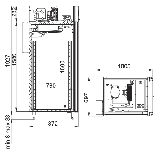 Каталог оборудования Холодильное оборудованиеШкафы холодильныеСпециализированные холодильные шкафыШкаф холодильный для вызревания сыра Polair CS107 Cheese полки нерж. Шкаф холодильный для вызревания сыра Polair CS107 Cheese полки нерж. Код товара: 062-628 Поделиться: WhatsAppTelegram СравнитьДобавить в КПВ избранное 0 391 000 ₽ В корзину 0 шт Под заказСамовывоз сегодня бесплатно Взять в кредит Купить в лизинг Получить консультацию в WhatsApp Описание Характеристики Отзывы 0 Инструкции 5 Шкаф холодильный для вызревания сыра Polair CS107 Cheese полки нерж. предназначен для создания оптимальных условий хранения и дозревания твердых и полутвердых сыров на предприятиях общественного питания и торговли. Монолитный цельнозаливной корпус выполнен из нержавеющей стали снаружи и изнутри (кроме задней стенки), что обеспечивает высокую механическую прочность и долговечность шкафа. Оборудование рассчитано на работу при температуре окружающей среды до 40 °С. Особенности: Верхнее расположение агрегата Многофункциональная русифицированная контрольная панель с 5-дюймовым дисплеем Возможность создания и сохранения собственных программ в памяти электронного блока Четыре перфорированные полки из нержавеющей стали Встроенный ультразвуковой увлажнитель (требуется подключение к системе подачи очищенной воды и централизованной канализации) Распашная дверь с заливной теплоизоляцией Заменяемый уплотнитель двери с магнитной вставкой Встроенная ручка для удобства открытия Отключаемая внутренняя LED-подсветка Штампованное углубление в дне корпуса для облегчения ухода Надежный замок Педаль для бесконтактного открывания двери Регулировка уровня влажности от 60% до 95% Максимальная нагрузка на каждую полку — 40 кг Толщина стенок корпуса — 43 мм Polair CS107 Cheese полки нерж. — это современный и надежный холодильный шкаф, который обеспечивает идеальные условия для хранения и дозревания твердых и полутвердых сыров. Прочный корпус, точное управление влажностью и температурой, а также удобство эксплуатации делают его отличным решением для предприятий общественного питания и торговли, стремящихся сохранить качество и вкусовые свойства сырной продукции.Изображение товара, представленного на фото, может отличаться от его фактического вида. Показать все Габаритные размеры697×1005×1960 ммДиапазон рабочей температурыот -2 до +30 °CДлина697 ммШирина1005 ммВысота1960 ммОбъём700 лКол-во дверей1 Тип двериМеталлическая Количество полок4 штДопустимая нагрузка на полку40 кгУровень влажностиот 60 до 95 %Холодильный агрегатВстроенный Тип оттайкиАвтоматическая Тип охлажденияДинамическое ПодсветкаЕсть ХладагентR290 Вес нетто144 кгВес брутто171 кгБрендPolairВсе специализированные холодильные шкафы Из нержавейки Оставить отзыв Еще никто не оставил отзыв на этот товар Схема POLAIR CS107 Cheese.jpgИнструкция на POLAIR CS107 Cheese.pdfБрошюра на POLAIR CS107 Cheese.pdfДекларация о соответствии.pdfСертификат соответствия.pdf Похожие товары Перейти в каталог Под заказ 399 500 ₽ Шкаф холодильный для вызревания мяса Polair CS107 Meat со стеклом (Тип 1) В наличии 405 365 ₽ Шкаф холодильный для хлебопекарных производств Polair CS107 Bakery Br черный, со стеклом (Тип 2) Под заказ 391 000 ₽ Шкаф холодильный для вызревания мяса Polair CS107 Meat (Тип 2) Под заказ 402 050 ₽ Шкаф холодильный для вызревания мяса Polair CS107 Meat со стеклом (Тип 2) Под заказ 414 545 ₽ Шкаф холодильный для хлебопекарных производс