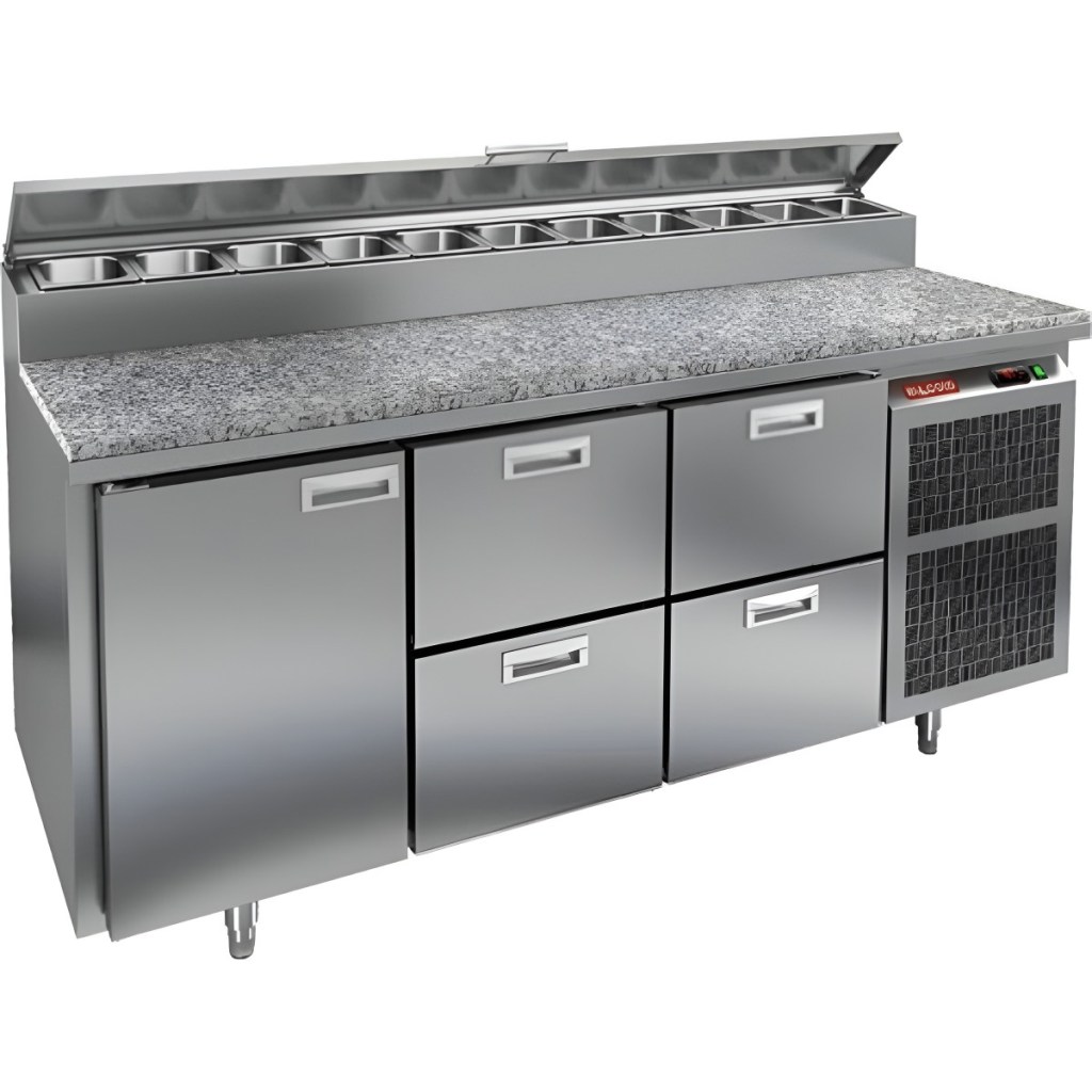 Каталог оборудования Холодильное оборудованиеСтолы охлаждаемыеСтолы холодильные для пиццыСтол холодильный для пиццы HiCold PZ2-122GN (1/6) камень Стол холодильный для пиццы HiCold PZ2-122GN (1/6) камень Код товара: 064-757 Поделиться: WhatsAppTelegram СравнитьДобавить в КПВ избранное 0 308 061 ₽ В корзину 0 шт Под заказСамовывоз сегодня бесплатно Взять в кредит Купить в лизинг Получить консультацию в Max Описание Характеристики Отзывы 0 Стол холодильный для пиццы HiCold PZ2-122GN (1/6) камень предназначен для кухонь и предприятий общественного питания. Он используется для раскатки теста, подготовки ингредиентов для пиццы, салатов и других блюд, а также для охлаждения и кратковременного хранения скоропортящихся продуктов. Модель совмещает гранитную рабочую поверхность и охлаждаемый отсек с 1 дверью и 4 ящиками, обеспечивая удобный доступ к ингредиентам и эффективное хранение. Особенности: Динамическая система охлаждения для равномерного поддержания температуры Автоматическая оттайка для удобного обслуживания Электронная панель управления для точной настройки параметров Вместительная внутренняя полка формата GN 1/1 (размер 530×325 мм) 1 дверь и 4 вместительных ящика для хранения ингредиентов Автоматические доводчики дверей с фиксатором открытого положения Легкозаменяемые магнитные уплотнители для герметичности Открытая агрегатная часть для легкого доступа к компонентам Регулируемые по высоте ножки для устойчивости Гранитная рабочая поверхность глубиной 486 мм и толщиной 50 мм — устойчива к повреждениям, высоким температурам и царапинам Толщина теплоизоляции: 50 мм Максимальная глубина гастроемкостей: 100 мм Вместимость салат-бара: 11 гастроемкости Стол холодильный HiCold PZ2-122GN (1/6) камень — это надёжный и функциональный стол для пиццы. Он сочетает рабочую поверхность и охлаждаемый отсек, облегчает хранение и подготовку ингредиентов, повышает удобство работы повара и соответствует стандартам профессиональной кухни.Изображение товара, представленного на фото, может отличаться от его фактического вида. Показать все Габаритные размеры1835×700×1000 ммДиапазон рабочей температурыот +2 до +10 °CРасположение агрегатаБоковое Материал столешницыГранитная Тип столаС дверьми и ящиками Тип двериГлухая Объём350 лТип гастроемкостейGN 1/6 Количество дверей1 штКоличество ящиков4 штРазмер полки530×325 ммНапряжение220 ВМощность0,5 кВтТип охлажденияДинамическое Тип оттайкиАвтоматическая Габариты в упаковке2000×850×1140 ммВес нетто172 кгВес брутто248 кгБрендHicoldВсе холодильные столы для пиццы Hicold Оставить отзыв Еще никто не оставил отзыв на этот товар Ранее просмотрено Под заказ 114 342 ₽ Стол холодильный для пиццы HURAKAN HKN-PZLG3 Под заказ 121 743 ₽ Витрина холодильная Dazzl Galaxy 080 Plug-in 150 Self динамика Под заказ 290 061 ₽ Стол холодильный для пиццы HiCold PZ1-1111GN (1/3) камень В наличии 186 899 ₽ Камера холодильная Polair КХН-11,75 (2560×2560×2200) Под заказ 435 322 ₽ Стол холодильный для пиццы HiCold PZ4-111/GN камень (R290)